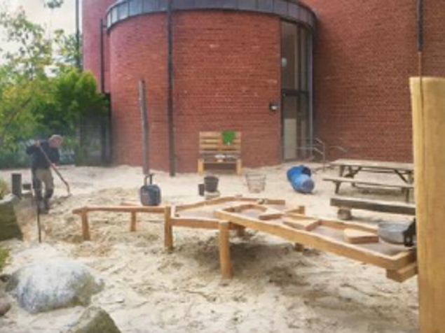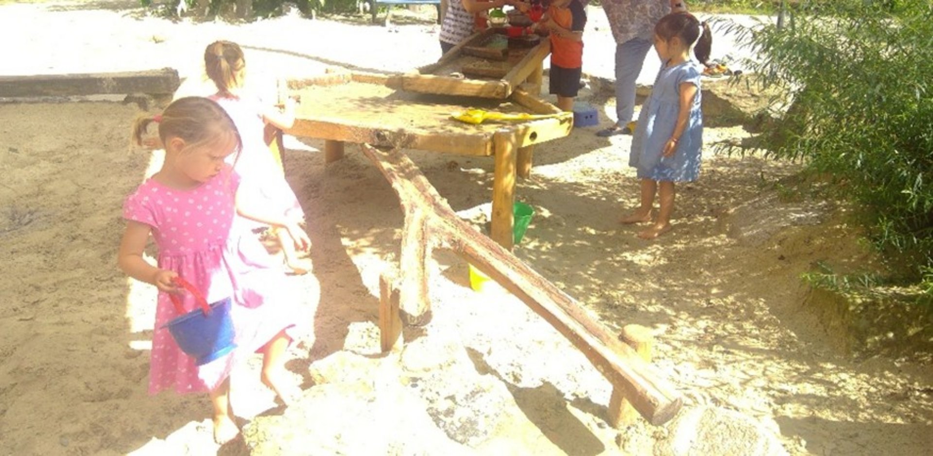 Eine Matschbahn aus Holz, Sandkästen, Baumstämme, Holzscheiben und eine selbstgebaute Küche mit alten ausrangierten Utensilien sind Quellen, die den Kindern die Natur begreifbar machen.